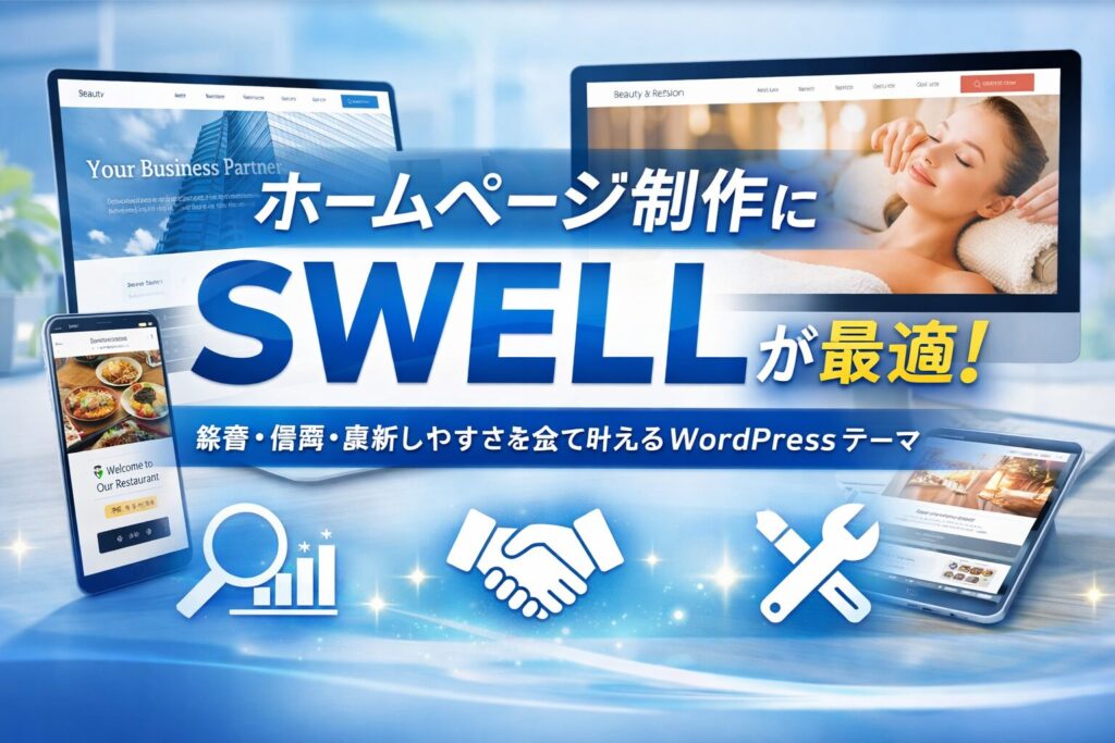 結論 SWELLは、集客・信頼・更新のしやすさを重視したホームページ販売に最適なWordPressテーマです。 理由 ホームページ制作を検討する多くの方は、次のような悩みを持っています。 見た目が安っぽくならないか不安 スマホ対応がきちんとできるか心配 納... -
